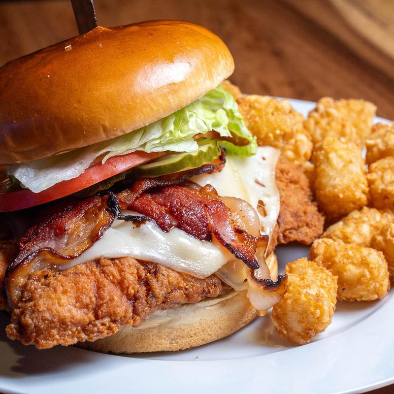 Crispy, grilled or spicy crispy chicken breast, crispy bacon, Swiss cheese, mayo, lettuce, tomato and pickle on a Brioche bun